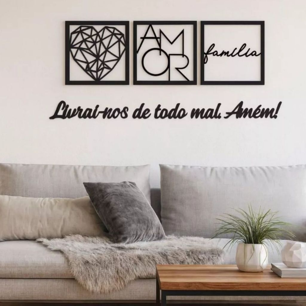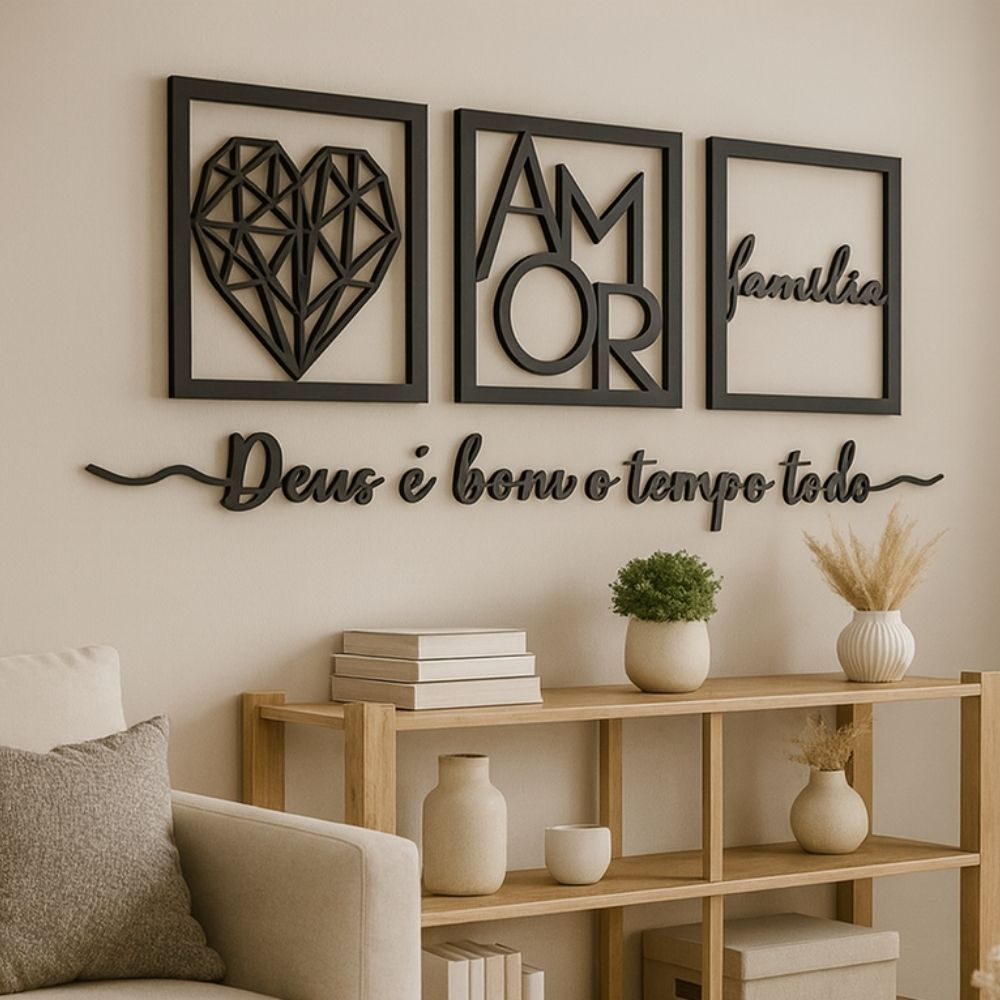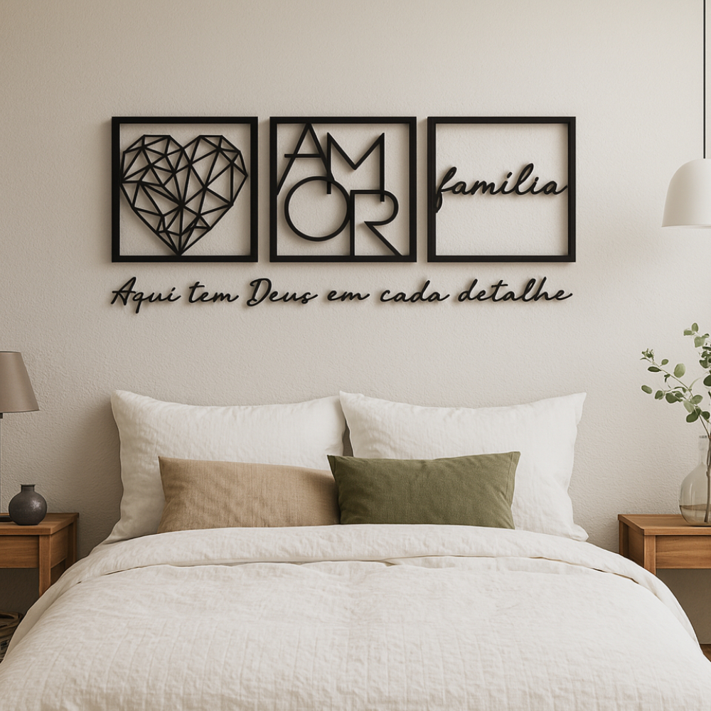 O Kit 3 Quadros Vazados Família Amor Coração Geométrico traz um design moderno, minimalista e sofisticado, perfeito para cabeceiras, salas e ambientes especiais.